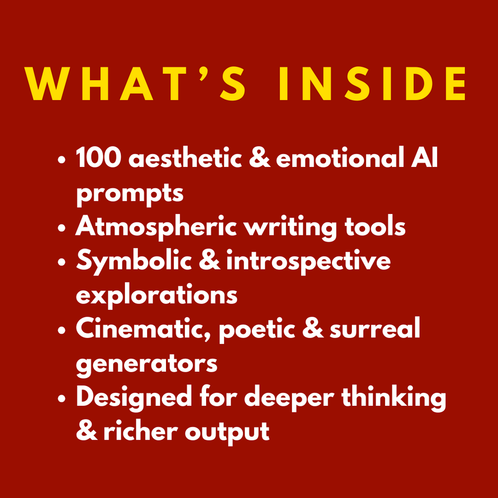 You’ll get 100 aesthetic, emotional and symbolic prompts designed to create atmospheric writing, deeper introspection, cinematic storytelling and beautifully human responses from AI.