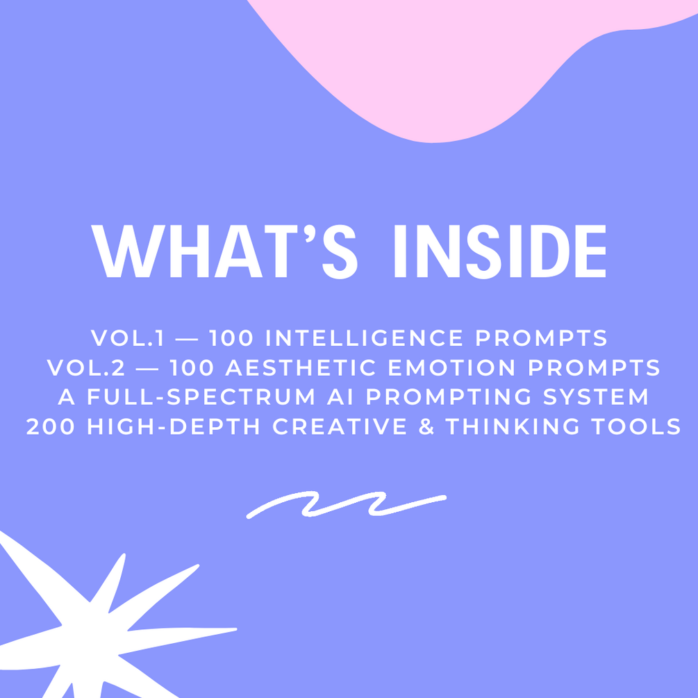 You’ll get 200 advanced AI prompts blending deep reasoning, aesthetic writing, emotional exploration, symbolic interpretation and high-level creative tools - a full-spectrum prompt system for smarter, richer and more human AI output.